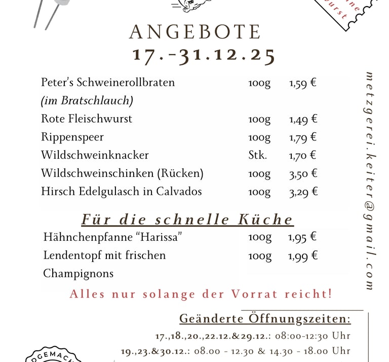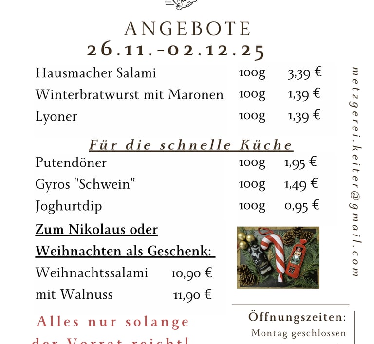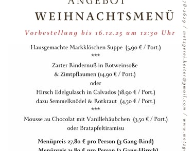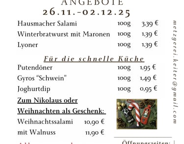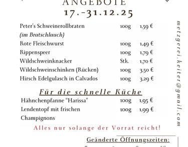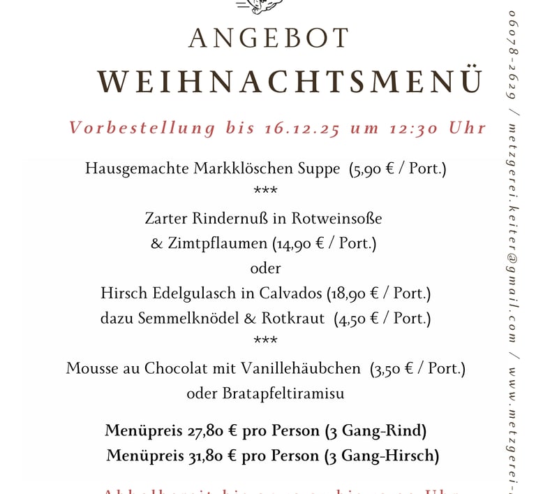 bitte beachten Sie auch die Vorbestell- und Abholzeiten an den Feiertagen im Dezember!