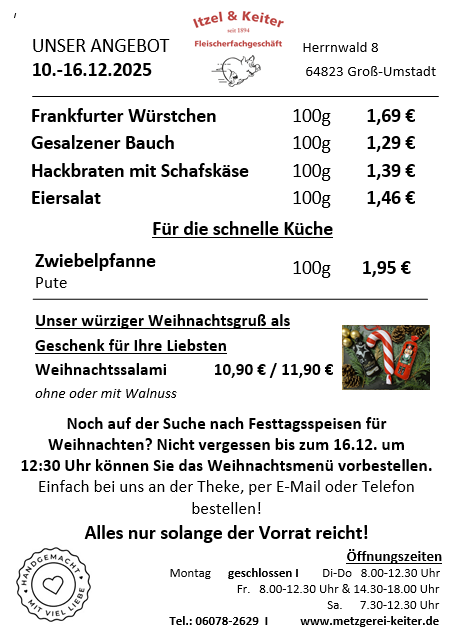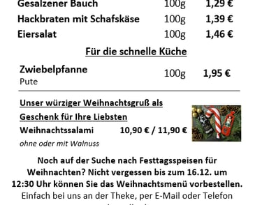 bitte beachten Sie auch die Vorbestell- und Abholzeiten an den Feiertagen im Dezember!
